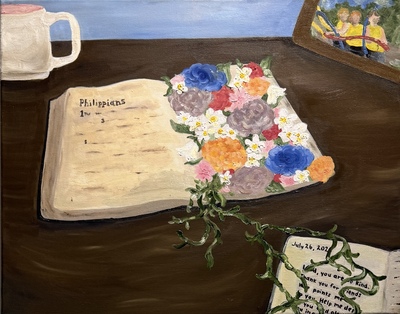 The subject of my work has recently shifted to mental health awareness. This is do to a tragedy that occurred in my family. It has caused me to reflect on my own mental health, and others around me who I know have struggled. When working on landscapes, floral centerpieces, or incorporating pets into my work, I often look to Peach McComb. She combines realism with abstraction. Another inspiration for me is Guy Denning. I gravitate towards the sketchy lines he incorporates into his finished pieces, as this is something I see throughout my works. I use my artwork to send a message about myself, others, or simply the world around me.