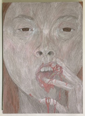 Artists that I’ve grown my inspiration from are artists like Jenny Saville, Marlene Dumas, Junji Ito, Maria Lassnig, and Chloe Piene. All of these artists have helped me figure out my own style when it comes to creating how I see myself and how I create the pain and distortion of my body.